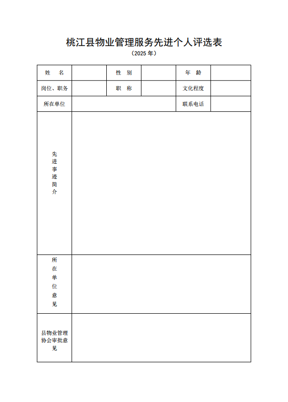 申报“先进个人”:需提交《2025年度桃江县物业管理服务先进个人申报表》(需加盖推荐单位公章)、个人身份证复印件、入职证明。