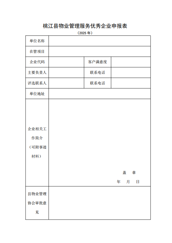 申报“优秀企业”:需提交《2025年度桃江县物业管理服务优秀企业申报表》(需加盖企业公章)、企业营业执照复印件(加盖公章)。